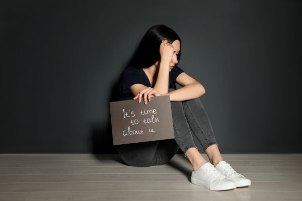 Women shielding her face and holding a sign that reads "It's time to talk about it" - this firs step in reducing domestic violence incidents in NJ and the country.As the holiday season approaches, most people look forward to celebrations and feelings of good cheer. Those involved in abusive relationships, however, experience heightened tensions and fear instead.